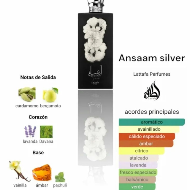 ANSAAM SILVER PRIDE de Lattafa es una fragancia que se destaca por su equilibrio de notas frescas y cálidas. Ideal para quienes buscan una esencia versátil y duradera. • Notas de Salida Cardamomo y Bergamota - En el Corazón Lavanda y Davana - De Fondo Vainilla, Ámbar y Pachulí.