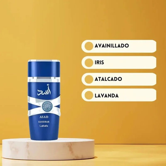 ASAD ZANZIBAR de Lattafa es una fragancia masculina que combina frescura, sensualidad y un toque gourmand en un aroma único y cautivador ,es perfecto para hombres que buscan una fragancia versátil y seductora, ideal para el uso diario y las épocas cálidas. • Notas de Salida Lavanda y Pimienta Negra - En el corazón Agua de Coco, Iris y sal - De Fondo Vainilla e Incienso.