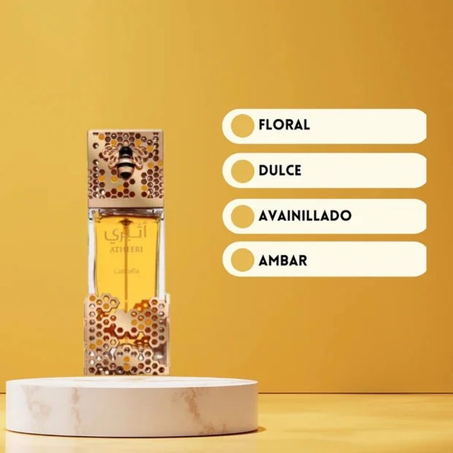Inspirado en FLORA GORGEOUS JASMINE de Gucci ATHEERI de Lattafa es una fragancia floral deliciosa, delicada, sofisticada y elegante. • Notas de Salida Flor de Pasionaria y Gota de Rocío - En el corazón Orquídea y Jazmín – De fondo Vainilla y Amberwood.