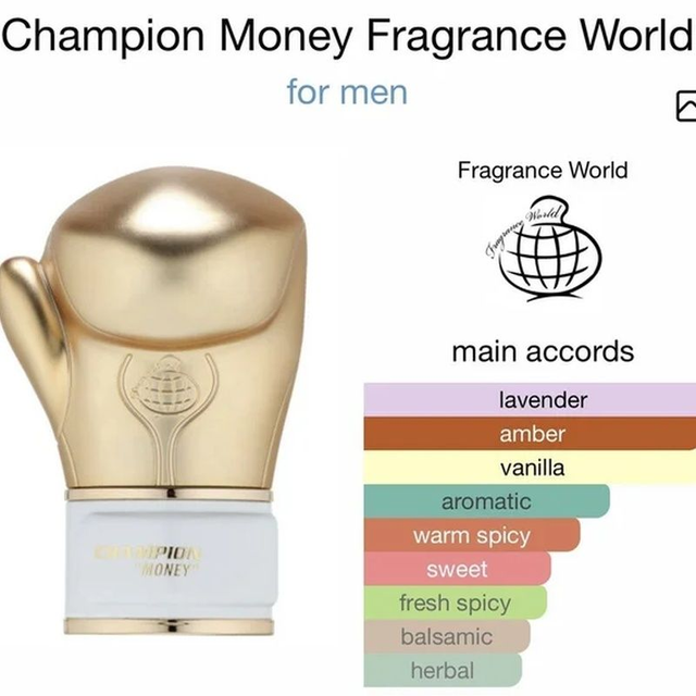 Inspira a Le Male Elixir de Jean Paul Gaultier. CHAMPION MONEY FRAGANCE WORLD es una fragancia creada para quienes nacieron para liderar. Su aroma refleja poder, elegancia y ambición, dejando una impresión inolvidable. Ideal para personas que no siguen tendencias, sino que las imponen. • Notas de Salida Bergamota y Abrótano - En el Corazón Lavanda y Benjuí - De Fondo Haba Tonka y Vainilla.
