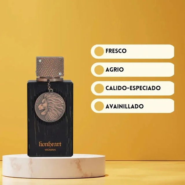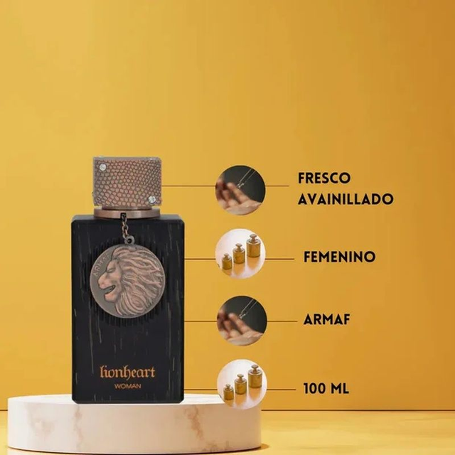 CLUB DE NUIT LIONHEART WOMAN de Armaf es una fragancia que rinde homenaje a la fuerza, la herencia y la férrea independencia de una mujer que conserva la sabiduría de generaciones y la audacia de forjar su propio camino. Diseñado para la mujer que busca un aroma dulce, envolvente y sofisticado. • Notas de Salida Vainilla y Lavanda - En el Corazón Jengibre y Cacao - De Fondo absoluto de vainilla.