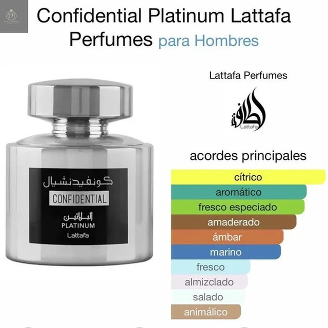 CONFIDENTIAL PLATINUM de Lattafa Eau de Parfum recuerda a Allure Sport de Chanel. Es una fragancia que combina frescura y sofisticación para el hombre que aprecia la elegancia y la frescura en cada momento. • Notas de Salida Cítricos, Bergamota, Ciprés y Pimienta Negra – En el Corazón Notas Marina, Notas Amaderadas e Incienso – De Fondo Ámbar Gris, Almizcle, Ládano y Musgo.