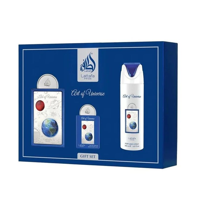 Inspirado en La temática del Universo. GIFT SET ART OF UNIVERSE de Lattafa es el set, que incluye una fragancia principal con un ADN moderno y versátil, busca despertar los sentidos del usuario. Creando una explosión de aromas cítricos y aromáticos. • Notas de Salida Mandarina, Jengibre, Bergamota y Menta - En el Corazón Pera y Flor de Azahar - De Fondo Almizcle, Ámbar y Cedro.