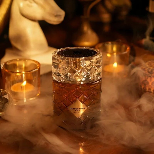 GOLDEN ELIXIR de Riffs es una fragancia que combina notas especiadas y dulces. Se caracteriza por su riqueza y elegancia, diseñado para despertar los sentidos y ofrecer una experiencia olfativa memorable. • Notas de Salida Coñac, Canela y Cardamomo - En el Corazón Haba Tonka, Praline y Ciruela - De Fondo Vainilla, Madera de Oud y Almizcle.