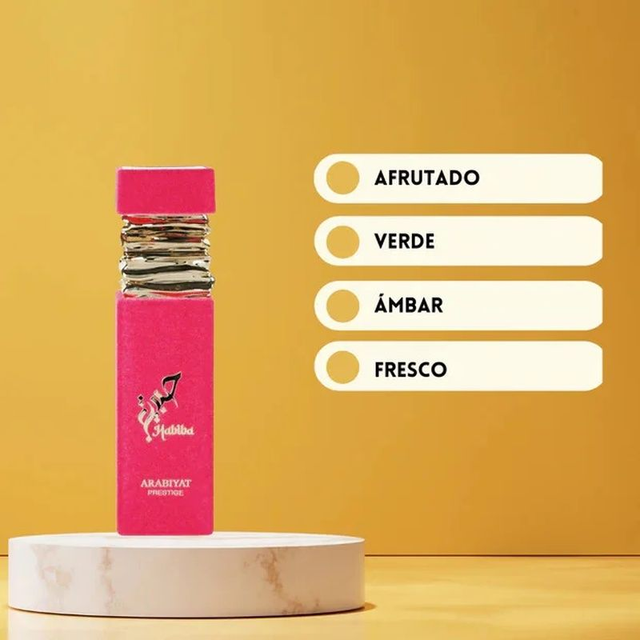 Inspirado en EDEN JUICY APPLE I 01 de Kayali. HABIBA de Arabiyat es un encantador, sofisticado y con una fragancia que deja una estela dulce, cálida y persistente. Ideal para el uso diario o momentos románticos. • Notas de Salida Lichi, Manzana y Notas Verdes - En el Corazón Fritos Rojos, Flores Blancas y Ámbar - De Fondo Caramelo, Almizcle y Musgo.
