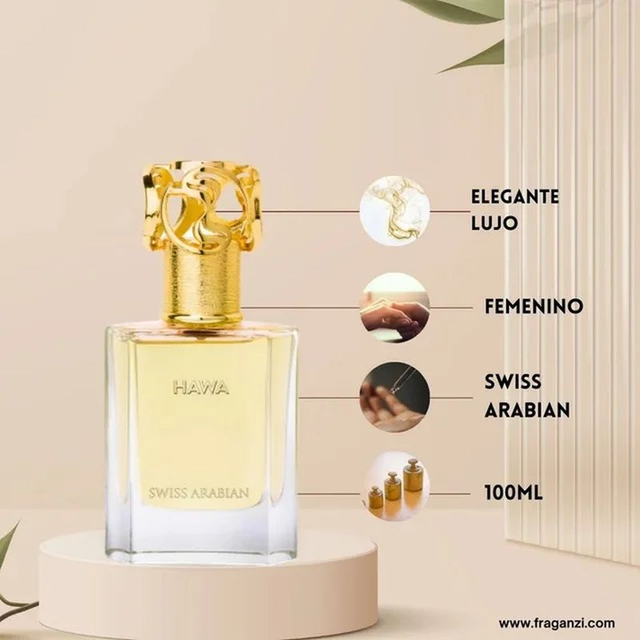 HAWA de Swiss Arabian es un perfume Exclusivo y Excepcional, que te transporta a un mundo de Glamour y Estilo y podrás sentir como atraes todas las miradas. • Notas de Salida Bergamota, Cardamomo, Ciruela, Mandarina y Ylang Ylang. – En el Corazón Azahar, Cachemira, Jazmín, Rosa. – De Fondo Almizcle, Cedro, Mirra, Pachulí, Sándalo, Vainilla, musgo de roble, Ámbar gris. .