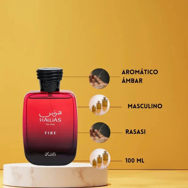 Inspirdo en a IMPERIAL VALLEY de Gissah. HAWAS FIRE de Rassasi es una fragancia intensa y sofisticada, para el hombre moderno con carácter. Combina frescura con una calidez que evoluciona a lo largo del día. Su aroma deja una impresión duradera y elegante, ideal para cualquier ocasión. • Notas de Salida Esclarea - En el Corazón Jazmín Egipcio y Notas Marina - De Fondo Ámbar, Ambar Gris y Notas Minerales.