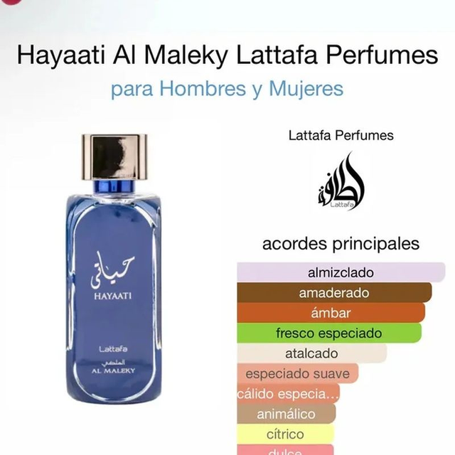 HAYAATI AL MALEKY de Lattafa es una fragancia que irradia opulencia, refinamiento y encanto majestuoso. Este exquisito perfume es la encarnación de la sofisticación y la grandeza, diseñado para aquellos que buscan lo mejor en la vida. Notas de Salida Nuez Moscada, Bergamota, Jengibre y Pimienta – En el Corazón Cedro, Madera, Labdanum e Incienso – De Fondo Musk, Ámbar y Ámbar Gris.