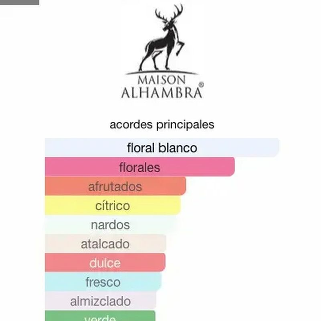 JARDIN DE PARIS de Maison Alhambra es una exclusiva fragancia, que representa la fuerza de las notas orientales y florales. Inspirado en el renombrado perfume J'adore Dior y Guerlain Jardin Bagatelle. • Notas de Salida Bergamota, Pera, Fresa, Frambuesa y Naranja- En el Corazón Jazmín y Datura - De Fondo Pachulí, Musgo, Vainilla, Almizcle y Cedro.