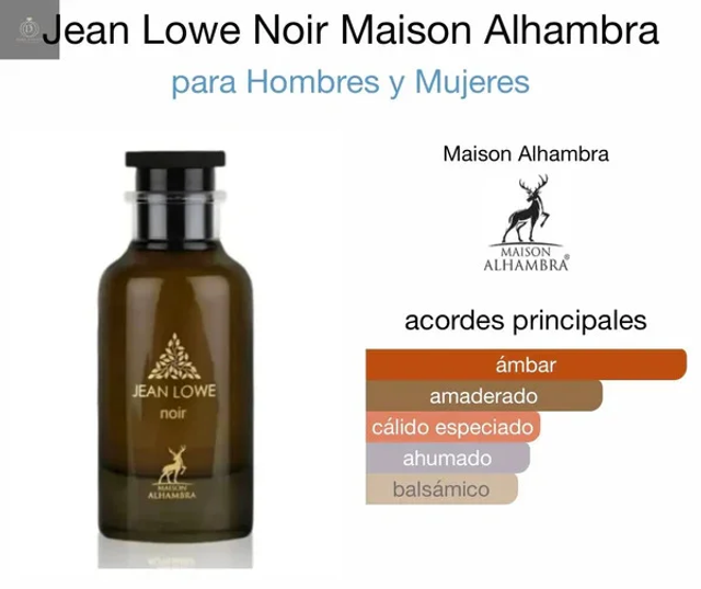 JEAN LOWE NOIR de Maison Alhambra es una fragancia que recuerda a Ombre Nomade de Louis Vuitton. Es un perfume de carácter sofisticado y envolvente inspirado en la riqueza del ámbar y las maderas, destacando por su intensidad, versatibilidad y profundidad aromática. • Notas de Salida Ládano, Pachuli, Sándalo, Cedro y Ámbar - En el Corazón Melón, Jazmín, Jengibre y Nuez Moscada - De Fondo Limo, Pomelo, Pimienta Rosa, Bergamota, Cilantro, Menta y Aldehídos.
