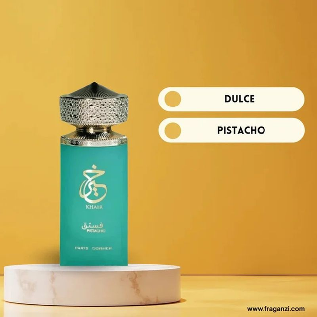 KHAIR Pistacho de París Corner destaca por su calidad superior. Si buscas un perfume que refleje sofisticación y originalidad, es la elección perfecta. Notas de Salida Pistacho, Helado, Bergamota, Cardamomo, Avellana y Ron – En el Corazón Pera, Frambuesa, Durazno, Peonia, Jazmín y Geranio – De Fondo Crema Batida, Malvavisco, Algodón de Azúcar, Haba Tonka y Cedro.