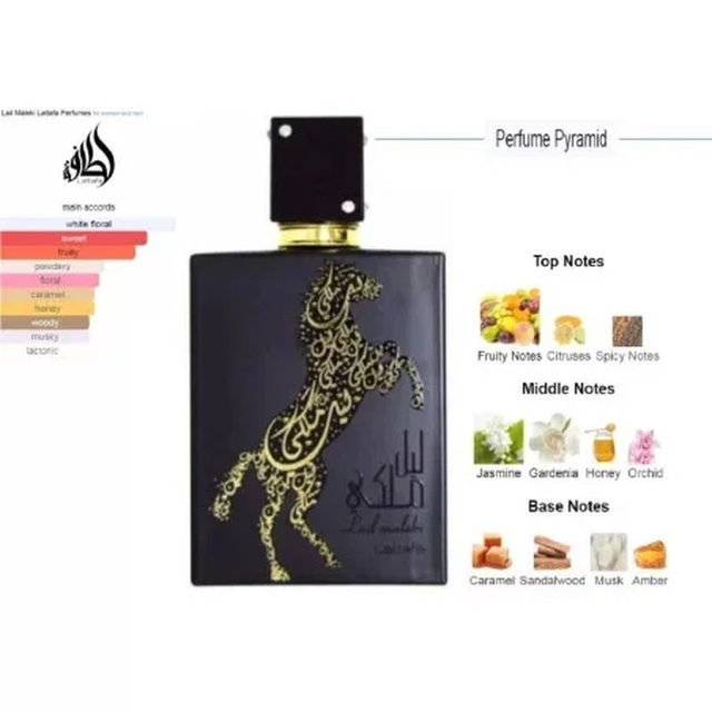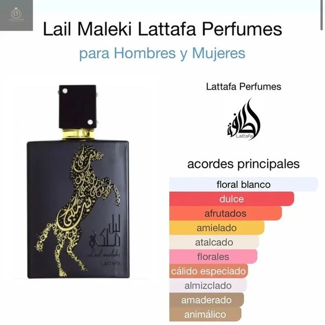 Lail Maleki Eau de Parfum es una fragancia para hombres y mujeres que te transporta al mundo místico de Oriente. Es un aroma rico y lujoso, lleno de notas exóticas que calientan el cuerpo y el alma. Cada capa del aroma está llena de misterio y grandeza, proporcionando una experiencia única. • Notas de salida Acordes Frutales y Cítricos. – En el Corazón Jazmín, Gardenia, Miel y Orquídea. – De Fondo Madera de Sándalo, Almizcle, Caramelo y Ámbar.