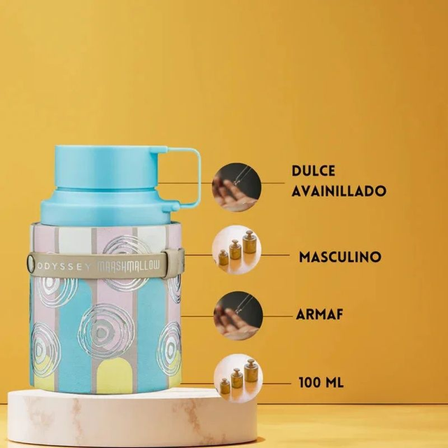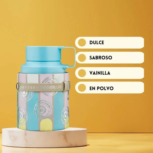 ODSYSSEY MARSHMALLOW de Armaf lanzado en 2025. Se trata de un Eau De Parfum floral afrutado y gourmand, que ha sido bien recibido por los amantes de los aromas dulces y reconfortantes. • Notas de salida: Manzana, Coco, Limón, Peonía y Lirio de los Valles - En el Corazón: Albaricoque, Marshmallow/nube, Melocotón, Frambuesa, Fresa y Flor de naranjo - Notas de Fondo: Ambar, Crema Glaseada, Almizcle, Praliné, Vainilla y Haba Tonka.