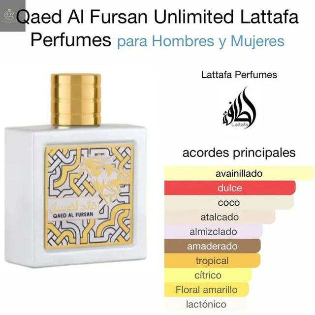 QAED AL FURSAN UNLIMITED de Lattafa es un perfume que recuerda a Coco Vanille Mancera. Esta Fragancia exquisita despierta los sentidos con un aroma brillante, rico y alegre, como un delicioso postre de frutas que desearás disfrutar una y otra vez. • Notas de Salida Coco, Cítricos y Piña – En el Corazón Ylang-Ylang, Franfipani y Jazmín – De Fondo Vainilla, Almizcle y Sándalo.