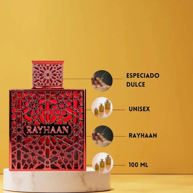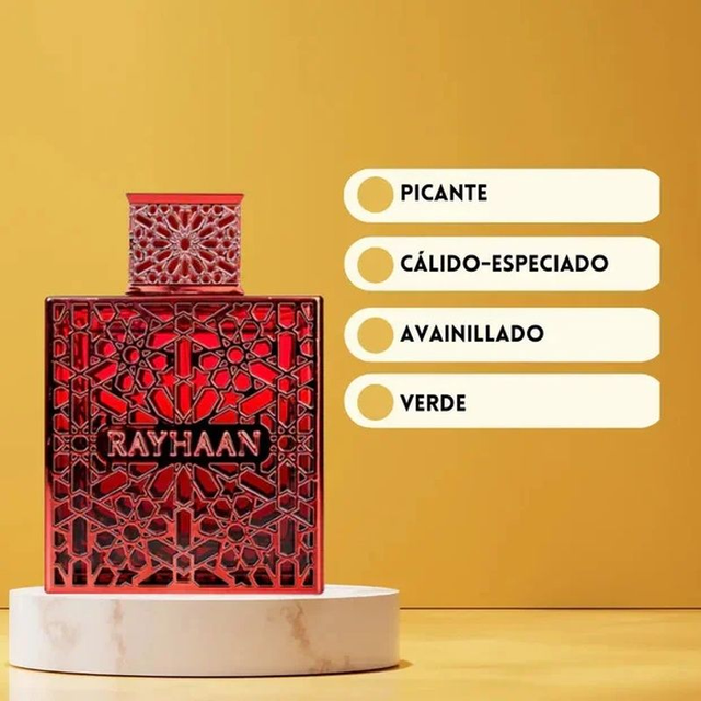 Inspirado en Nicho CRITENTAUS de Creed Centaurus. RAYHAAN CRIMSON se caracteriza por ser un aroma cálido, intenso y sofisticado, ideal para climas fríos y ocasiones especiales. • Notas de Salida: Canela, Cardamomo y Pimienta Rosa, En el Corazón: Sándalo, Pachulí, Heliotropo, Geranio y Jazmín, De Fondo: Benjuí, Vainilla, Haba Tonka y Ambroxan.