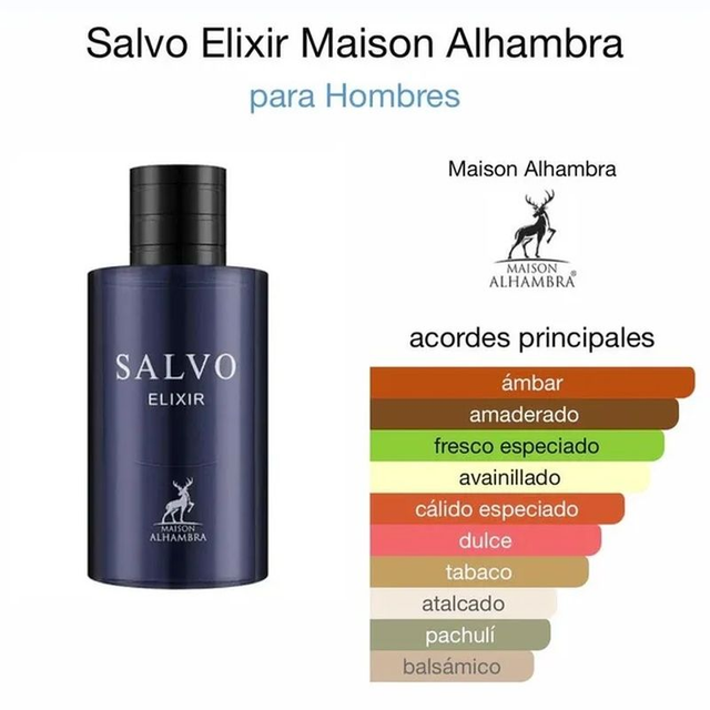Recuerda a Sauvage Elixir Dior SALVO ELIXIR de Maison Alhambra es una fragancia poderosa y magnética, diseñada para hombres audaces y sofisticados. Esta fragancia combina notas intensas y contrastantes, creando un aroma irresistible y lleno de carácter. Notas de Salida Pimienta Negra, Tabaco y Piña – En el Corazón Iris, Pachuli y Café – De Fondo Ladano, Vainilla, Ámbar, Notas Amaderadas y Benjuí.