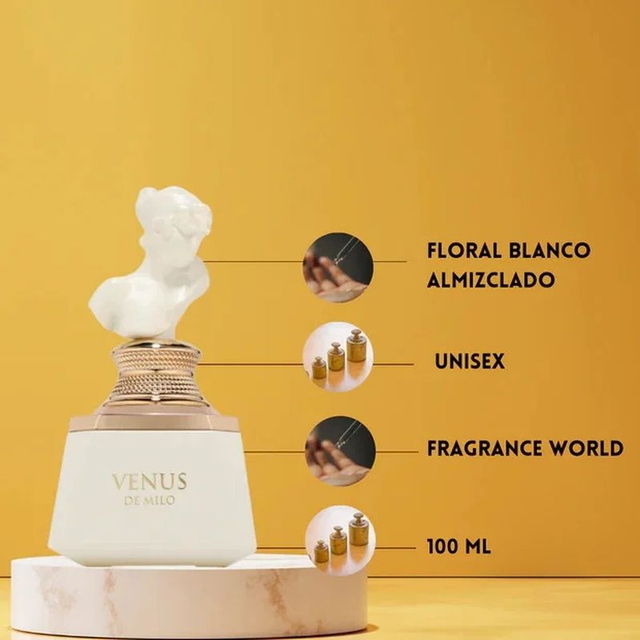 Inspirado en La Vie Est Belle de Lancôme. VENUS DE MILO de French Avenue es una fragancia que irradia dulzura y sofisticación. Su aroma seductor crea una sensación memorable. • Notas de Salida Caramelo, Pera, Néctar y Naranja Dulce - En el Corazón Lirio de los Valles, Jazmín y Leche - De Fondo Benjuí, Almizcle, Ambroxan y Vainilla.